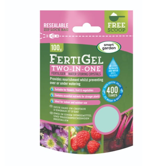 The Fertigel 2 in 1 fertiliser from Smart Garden is suitable for use on flowers, fruits, and vegetables to provide nourishment whilst water storage crystal prevents over or under-watering.
