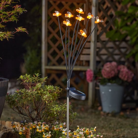 Designed with eight flexible wire stems, each topped with a detailed bee-shaped LED, the light gently sways in the breeze bringing a natural, lifelike feel to your display. The integrated solar panel charges during the day and powers the LEDs automatically from dusk, so you can enjoy stress-free lighting every night. Built for the British weather and finished in subtle tones, it’s the kind of decoration that feels right at home in any garden. Whether you’re enhancing a small urban balcony or a larger landscaped lawn, this stake light offers a practical way to add personality without the effort.