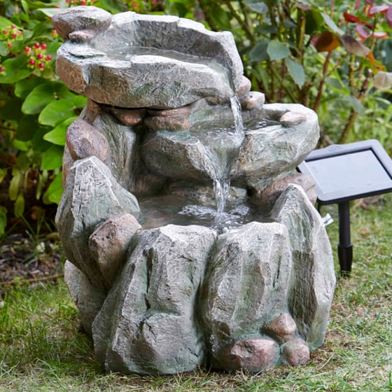 The rockfall fountain utilises a low voltage solar pump to constantly re-circulate water from the main bowl reservoir. The fountain will work in direct sunlight with a remote solar panel. It's very easy to install and there's no need for mains wiring.