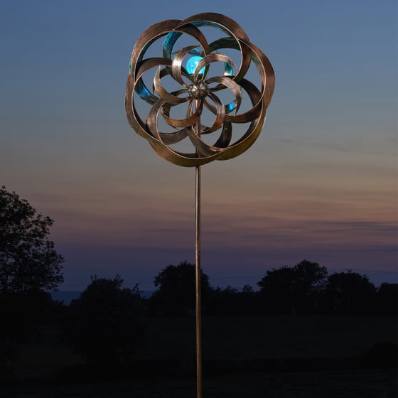 The solar powered wind spinner will brighten up your garden at night with the solar powered crackle globe that automatically illuminates in the dark. During the day it'll be a fantastic decorative feature. The brushed bronze effect finish is a beautifully finished reflective surface for the lights to bounce off.