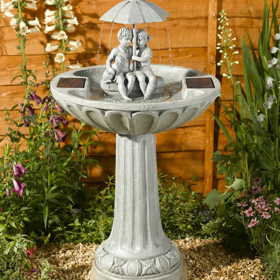 This delightful Solar Solar Umbrella fountain from Smart Garden would be a fabulous addition for your garden. The water feature is decorated with a boy, girl and dog figurine. They are stood in the middle holding an umbrella that creates a beautiful pouring rain effect from the re-circulated water.
