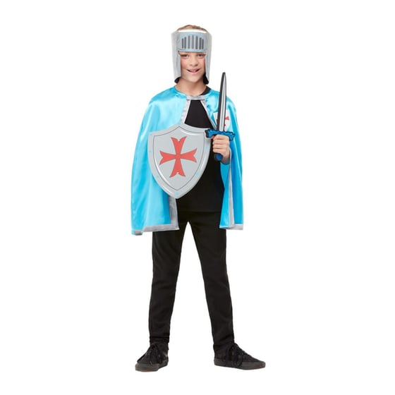 This knight costume has been designed with a satin blue style cape with a silver trim and a coat of arms on the left-hand side. To complete the look, included is an EVA Foam helmet, sword, and shield.