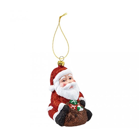 Sparkling hand-painted sitting Santa with hanging loop.