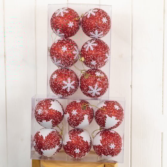 Decorate your tree with this red 6 pack of Christmas baubles.This pack includes 6 ornaments, each with either a unique snowflake or Christmas tree design. Add a festive touch to your festive decor and make your tree stand out with these beautiful baubles. The baubles feature a glitter design which will add a pop of colour to your Christmas displays.