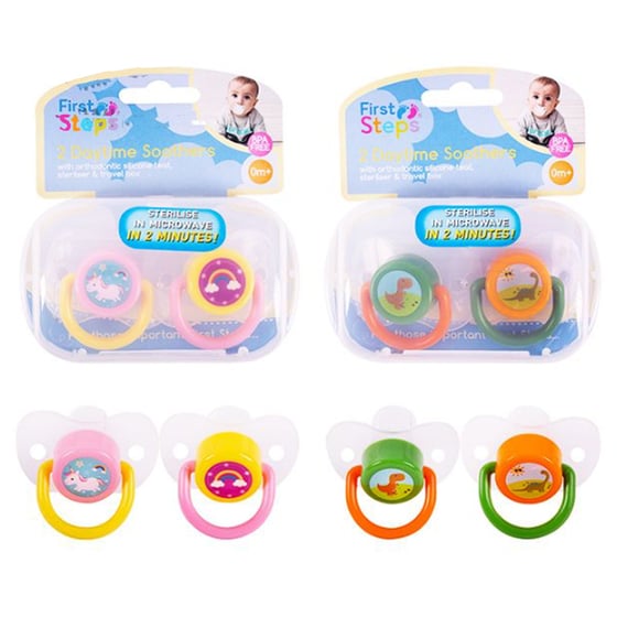 First Steps Day Time Soothers for newborns feature vibrant colours and fun imagery.