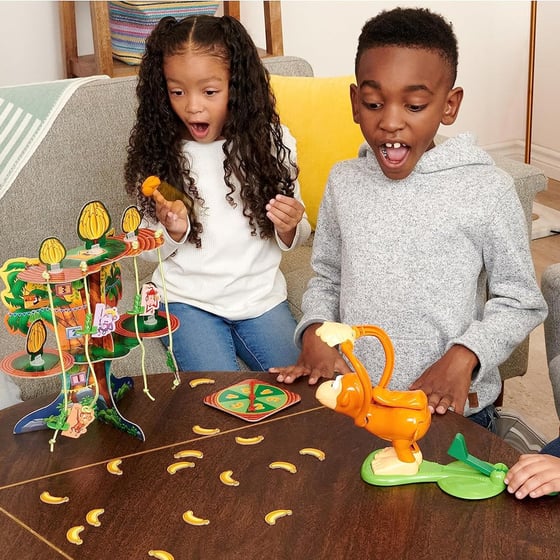 Have lots of hilarious fun and get ready to laugh out loud with the Spin Master Games monkey see monkey poo game which can be played with 2-4 players. The game is very easy to play as you simply fill with poo, fling poo, collect bananas and climb.