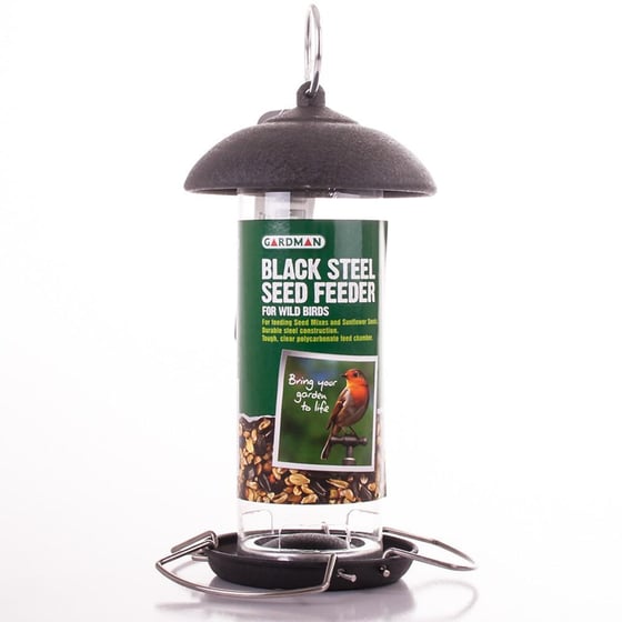 Our Gardman black steel seed feeder offers just that, the extremely robust design is made from powder coated steel and polycarbonate for an extra long life and can be broken down into three components easily for cleaning and refilling.