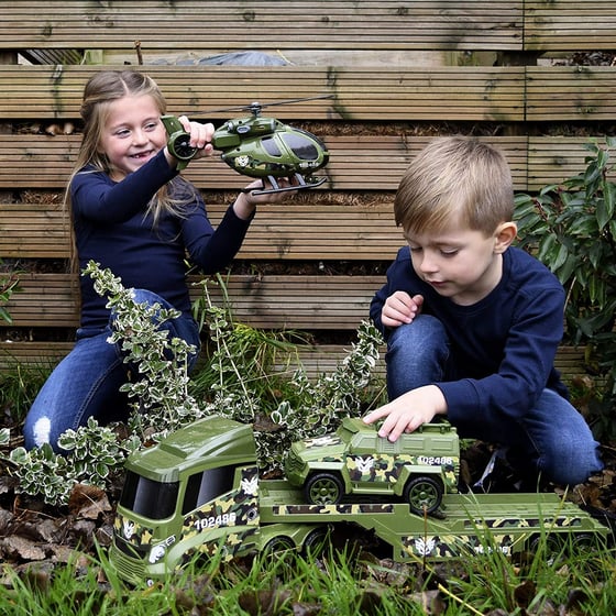 Let your little ones' imagination run wild with this fantastic military transporter set which will provide them with hours of imaginative vehicle fun. The children can create their own rescue missions to be able to save soldiers in the battlefield and fly them to safety just like a real-life Military Helicopter.