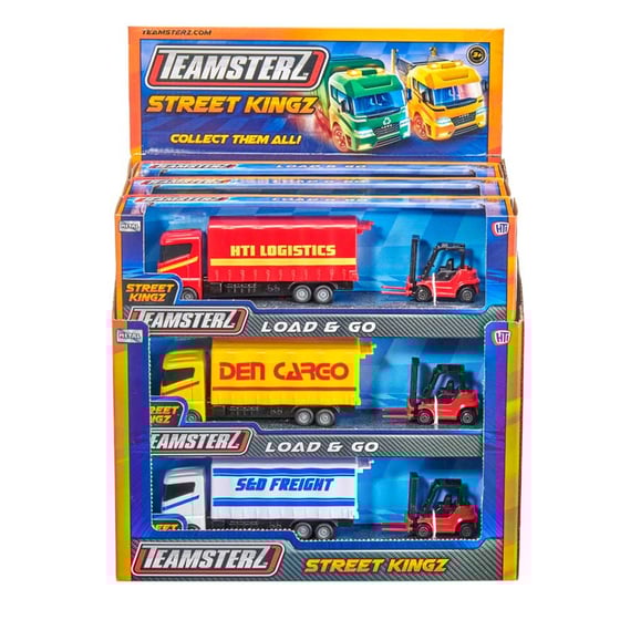 The lorries have a curtain side detail and all have their own business name on the side. Each carries a box of 'Toys' supplied with the forklift to get the cases onto the lorry.