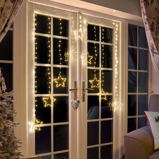 Add a festive touch to your windows and doors with these fabulous warm white star curtain string lights from Three Kings when they are illuminated they will turn the heads of your guests and any other passers-by as they shine bright in the night and create a wonderful ambient effect that creates a festive atmosphere.