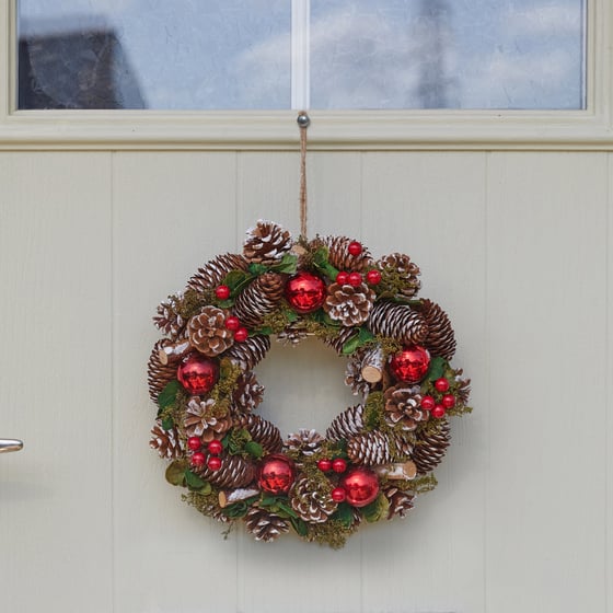 The wreath features frosted pinecones, glistening red berries and shining red baubles all held together by traditional foliage which when all together brings a level of sophistication to your home. It's so easy to set up as it comes ready to use and features a sturdy hanging loop which enables the wreath to be hung up for many Christmasses to come.