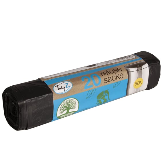 Tidy up your home with the 50L black refuse sacks from TidyZ which are 100% recyclable and 100% recycled.