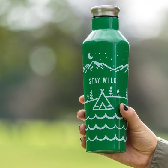 Keep hydrated with this pure stay wild double walled water bottle from Typhoon which has been made from stainless steel and features a fun camping inspired design in light dark green with ''Stay Wild'' text.