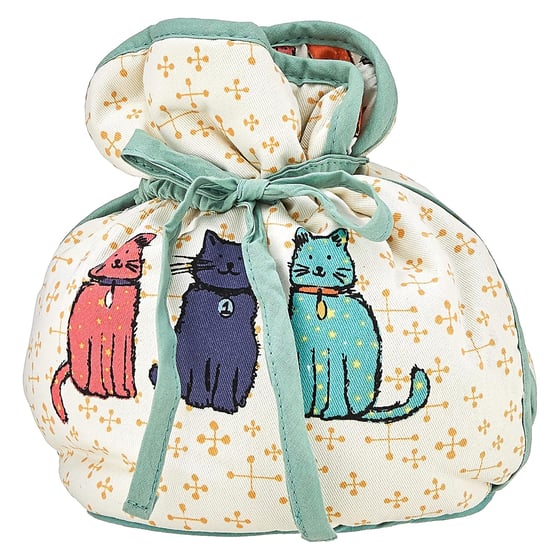 This Catwalk Muff Tea Cosy Features Illustrated Images Of Colour Cat Characters On A White And Subtle Gold Background.