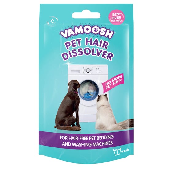The pet hair dissolver from Vamoosh uses active oxygen to break down any keratin in the hair which ultimately dissolves the hair strands so they can wash away. The dissolver eliminates odours and will leave your bedding and machine hygienically clean. There's no chemical residue and contains zero chlorine bleach. It's a must-have to create a hair-free machine.