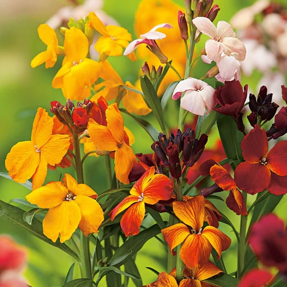The wallflower seeds Persian carpet mix contains many beautiful colours seen in Persian Carpets including cream, apricot, orange, rose, purple, and gold.
