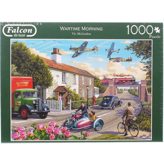 This exceptional 500 piece Falcon De Luxe jigsaw puzzle is titled Wartime morning and it's part of the wonderful Falcon De Luxe nostalgia collection. The jigsaw pictures the striking scene from one morning during the war time in a truly remarkable village. It's a glimpse of how people during the war would still get on with their every day lives even though there's a war going on.