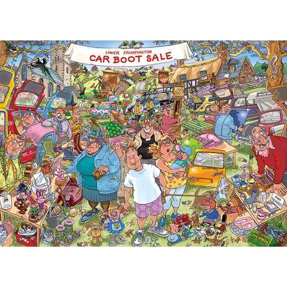 Car boot capers is the title of this fantastic jigsaw from Wasgij and it's prime shopping time for all the bargain hunters at the Lower Frumpington Car Boot Sale with plenty of bobby-dazzling deals to be had.
