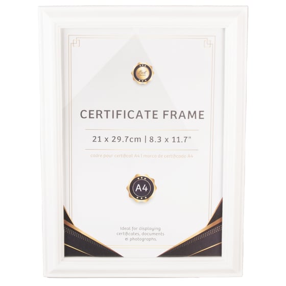 Display your cherished achievements and memories with pride using this elegant white A4 certificate frame. Perfect for showcasing academic certificates, professional qualifications, awards, or treasured photographs, this frame adds a touch of sophistication to any wall. The crisp white finish complements any décor style, from modern office spaces to traditional home settings. Designed specifically for A4-sized documents (21 x 29.7 cm), this frame ensures your important papers are protected while being beautifully presented. The clean lines and professional appearance make it ideal for both residential and commercial environments. Easy to mount and featuring a clear protective front, this frame helps preserve your valuable documents while making them a striking focal point. Whether you're creating a gallery wall of achievements or highlighting a single special certificate, this frame offers the perfect blend of functionality and style.