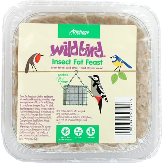 The insect fat suet feast contains a high mixture of seeds and insects to provide a high energy source of food for birds. It's a great feed for all year round feeding and can be used within bird tables and bird feeders.
