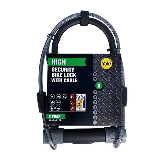 U-locks are the most widely used bicycle security solution. The new High Security U-lock from Yale are both convenient, strong, and secure. Constructed from ultra hardened steel, and with double point locking technology, they are designed to resist all forms of attack. This lock includes the Yale security cable with gives added security and flexibility in use.