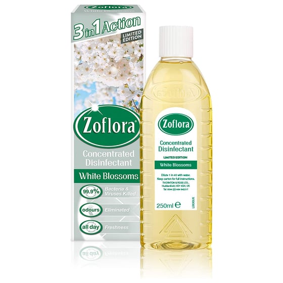 Zoflora disinfectant can be used on floors, baths, tiles, taps, worktops, drains, dishcloths, toilets & potties. The disinfectant has been made with a White Blossoms scent which is an elegant floral blend of hyacinth and white flowers, finished with earthy tones of moss and cedarwood.
